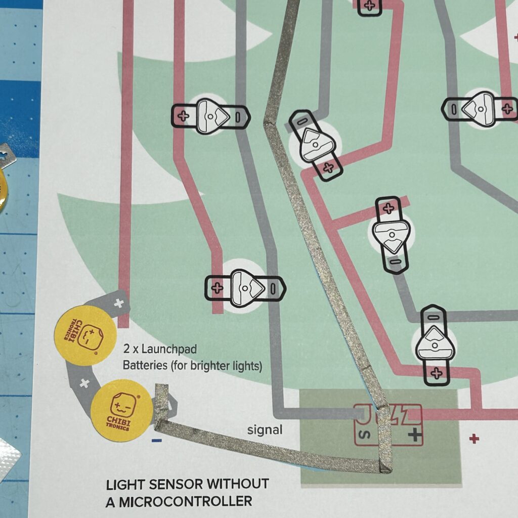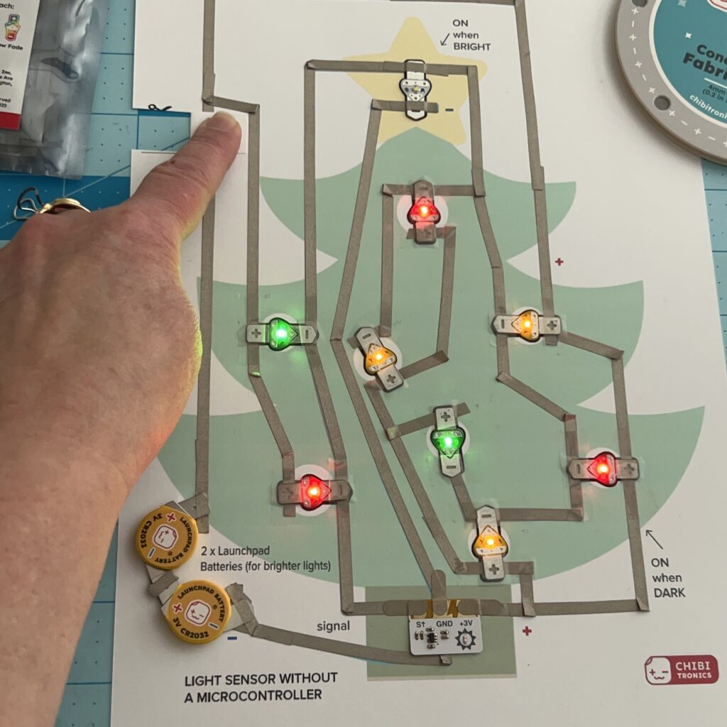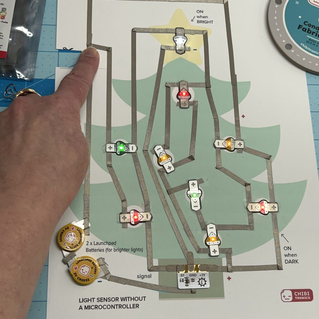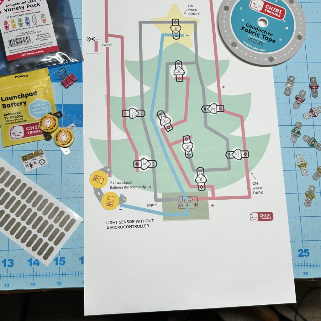 In this post, I’ll show you how to use a Light Sensor Sticker to make a light-sensing tree with Chibitronics Launchpad LEDs. We’ll add a bit of light-reactive magic — without coding!