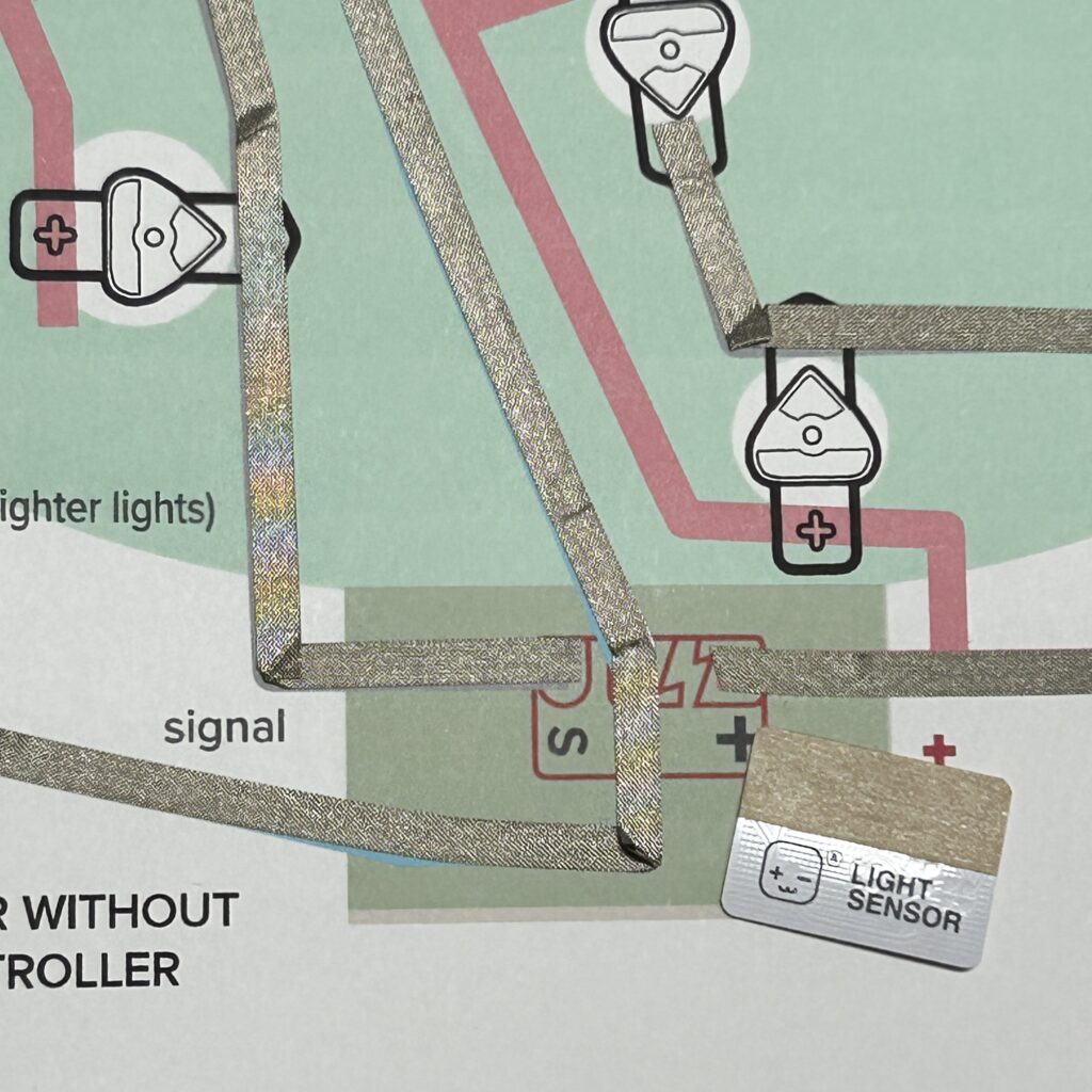 When applying the negative (-) trace that connects to the battery, be sure to use a continuous piece of Conductive Fabric Tape that extends underneath the Light Sensor Sticker. Secure the sensor in place with Conductive Fabric Tape Patches .