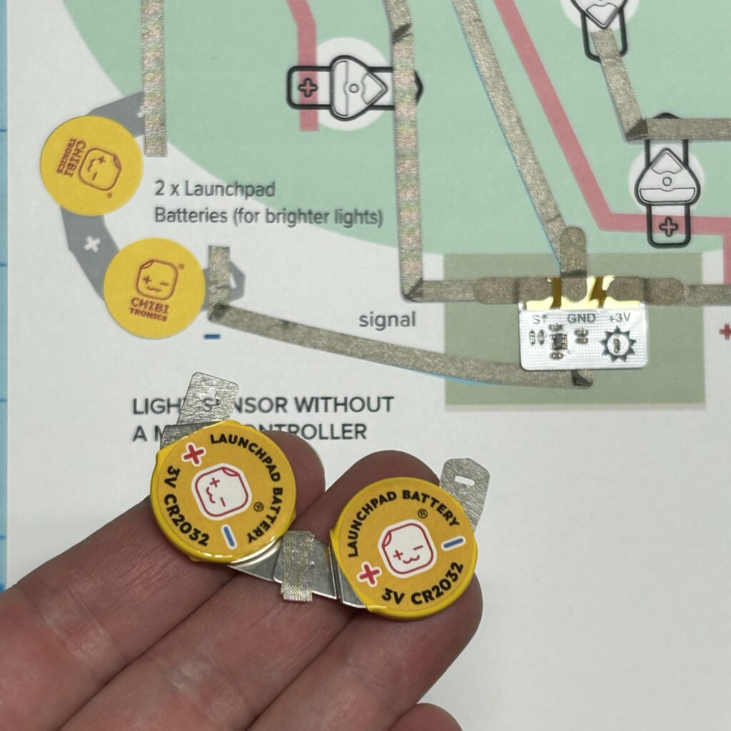 After you’ve connected the Light Sensor, connect two Launchpad Batteries in series, by overlapping the negative pad of one battery on top of the positive pad of a second battery. Secure the overlapped pads with either Conductive Fabric Tape or Scotch Tape. The pads need to stay connected in order for power to flow through the circuit.