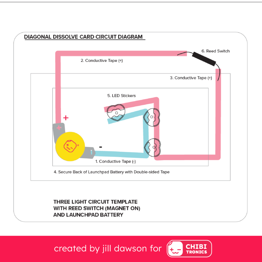 My latest tutorial for Chibitronics, a mechanical card with a Valentine’s Day theme, is a seasonal spin upon an earlier project, the Spooky Spider Diagonal Dissolve Card. Like its predecessor, the LEDs in this project are triggered by a lever (and a concealed reed switch and magnet combination).