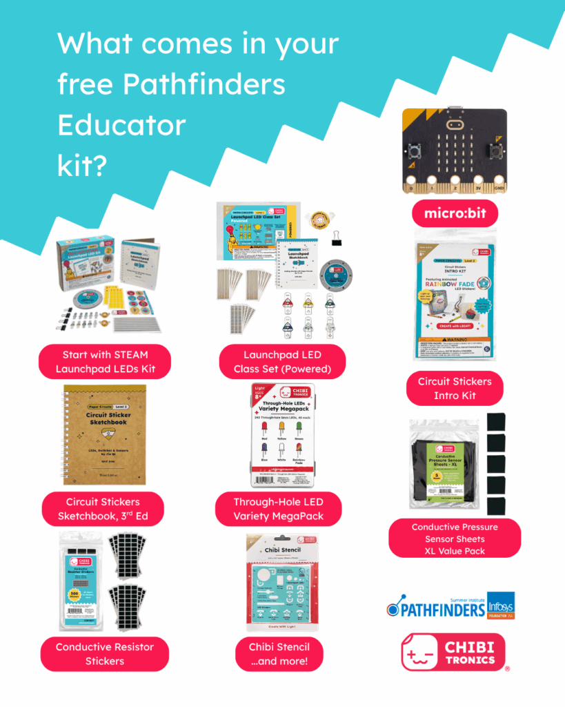 All participants will receive full scholarships for hands-on virtual professional development and a FREE kit of materials (valued at over $400), including a Pathfinders Workshop Educator Set and a class set of Chibitronics supplies shipped directly to you!