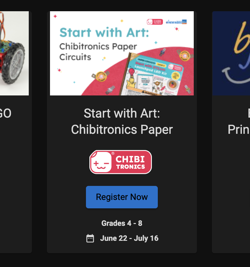 - Scroll all the way to the right until you see our Start with Art: Chibitronics Paper Circuits course thumbnail. Click Register Now.