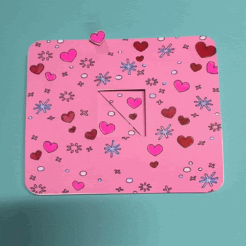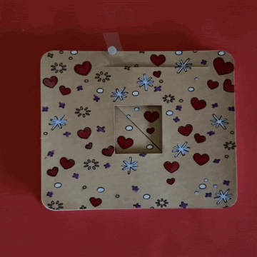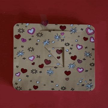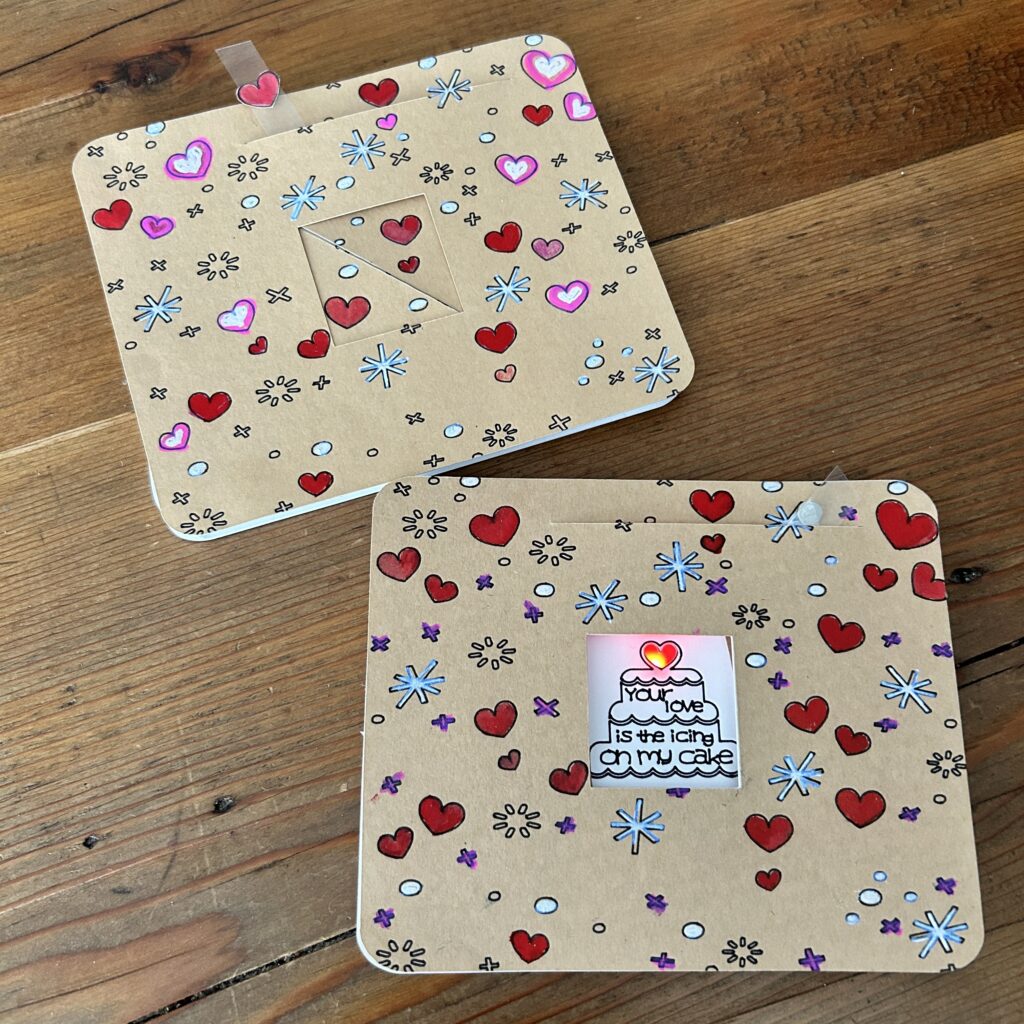 The first step in making your own mechanical card is to cut out the parts by visiting my free project on Cricut Design Space,. There you’ll find a couple of different options for the central artwork: a cake with a single cut-out heart (depicted below) or a love note with three cut-out hearts (depicted at the top of this page).