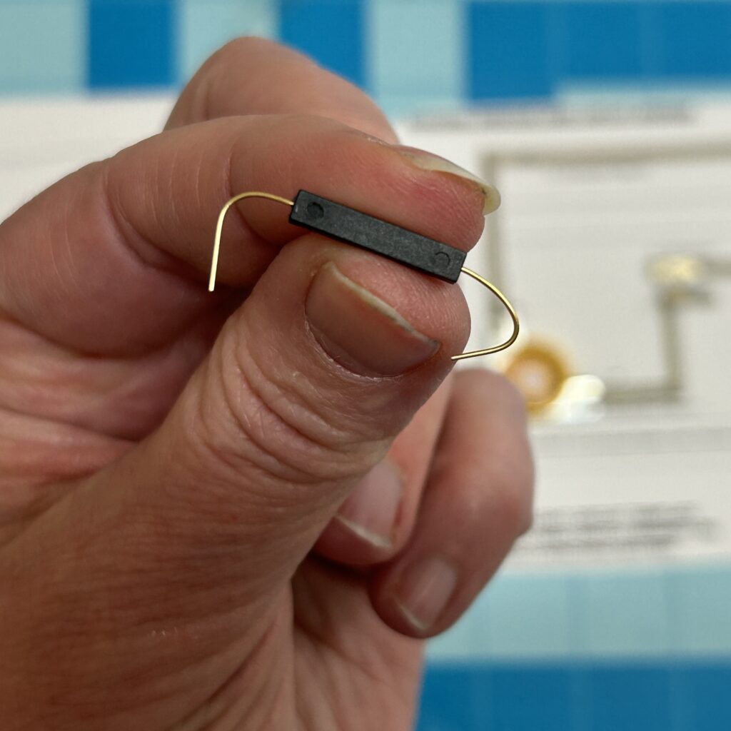 The last part of building the circuit is adding a Reed Switch (magnet on)) in the top right corner of your template. You may need to fiddle with it to determine which of its four sides is most susceptible to the magnet. Usually, that side will come marked with two tiny recessed circles.