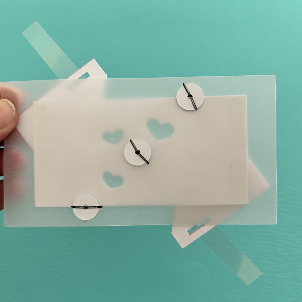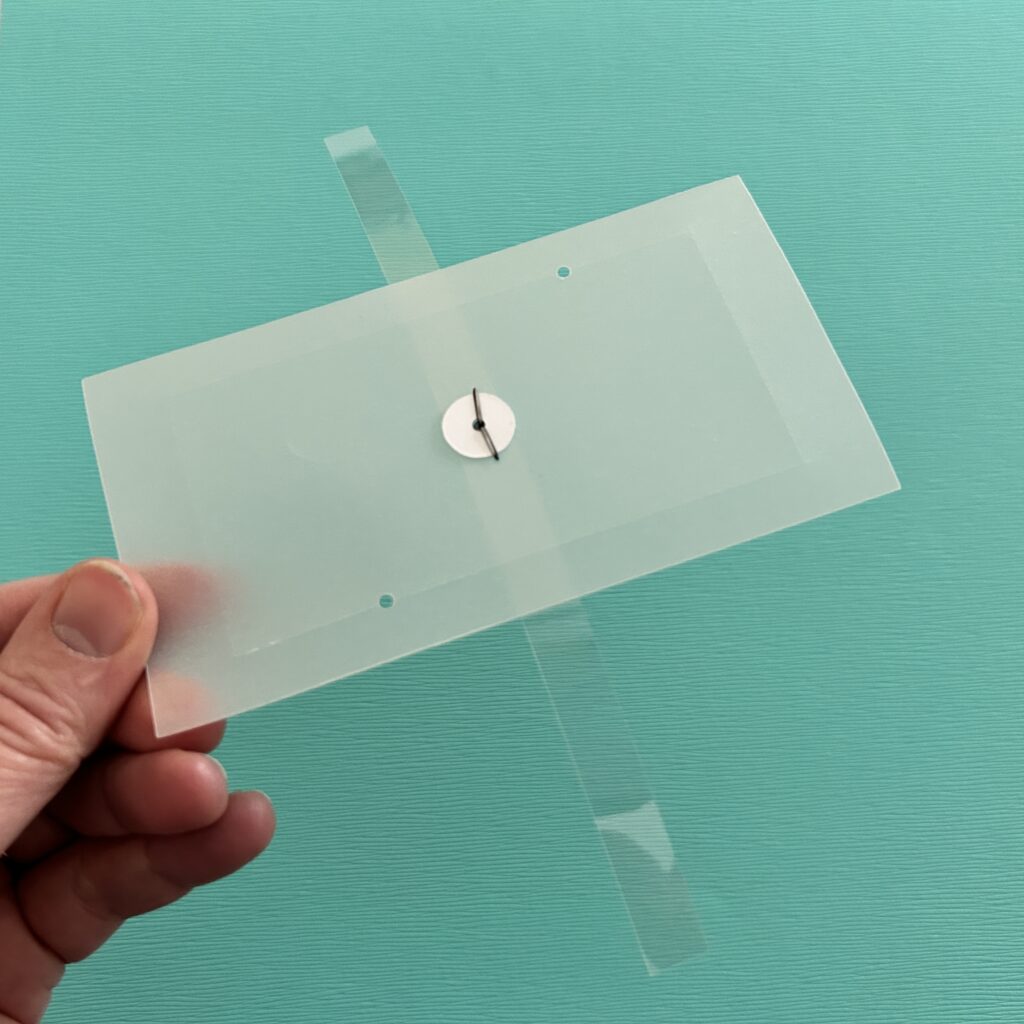 Attach the acetate strip to the center of the vellum piece, by placing a metal brad through it. and securing it with a paper washer.
