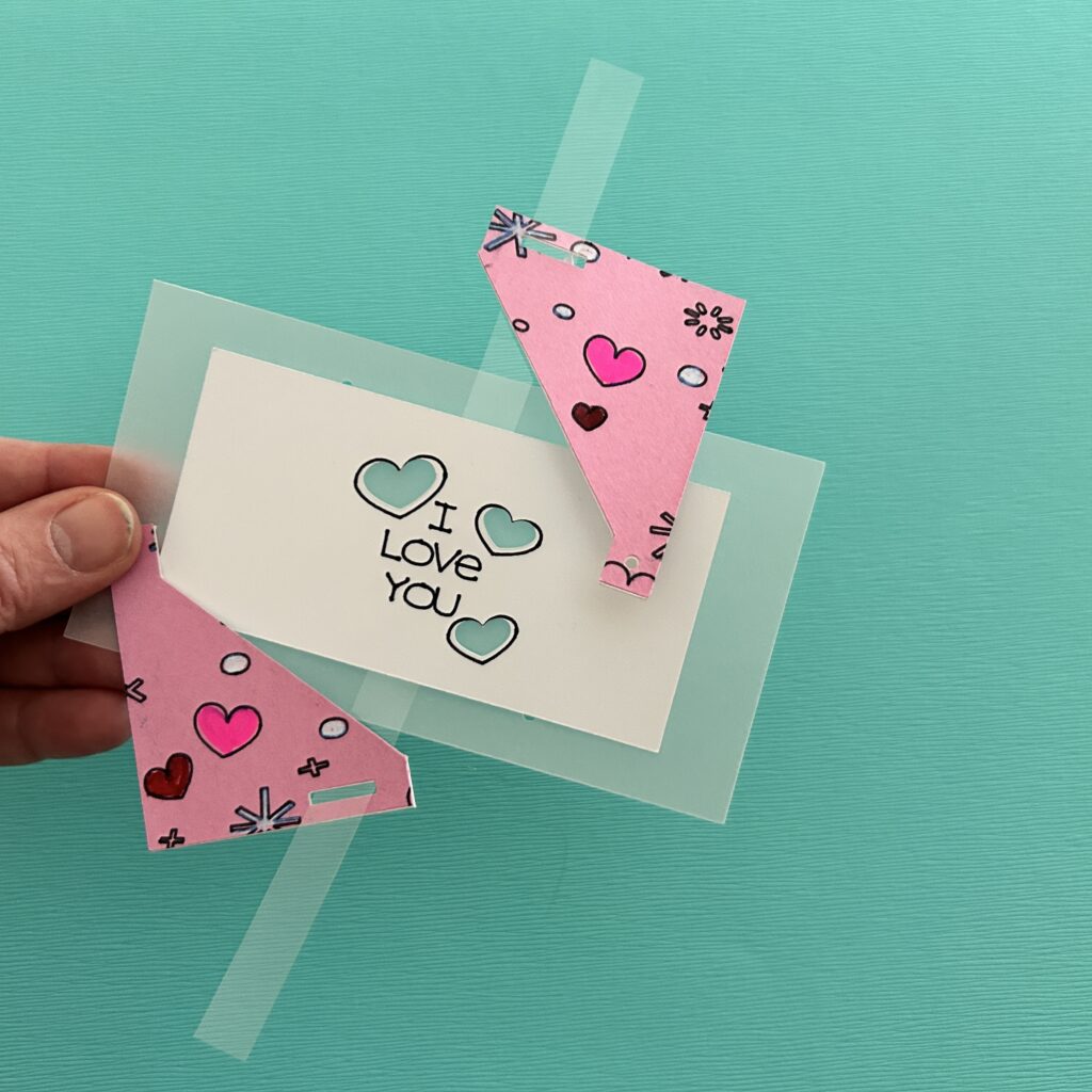Then, slide each of the diagonal doors onto the lever, keeping the artwork oriented upright, so that the pattern on the doors aligns with the art on the card top.