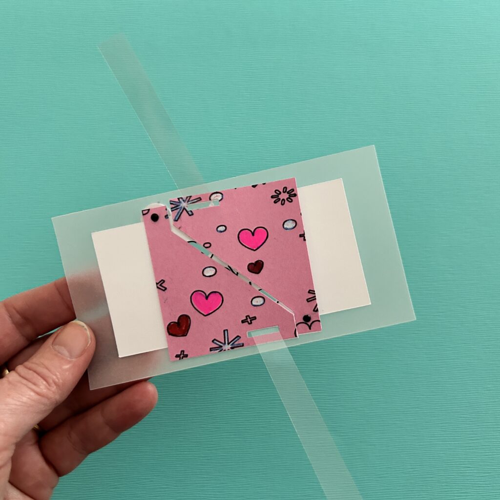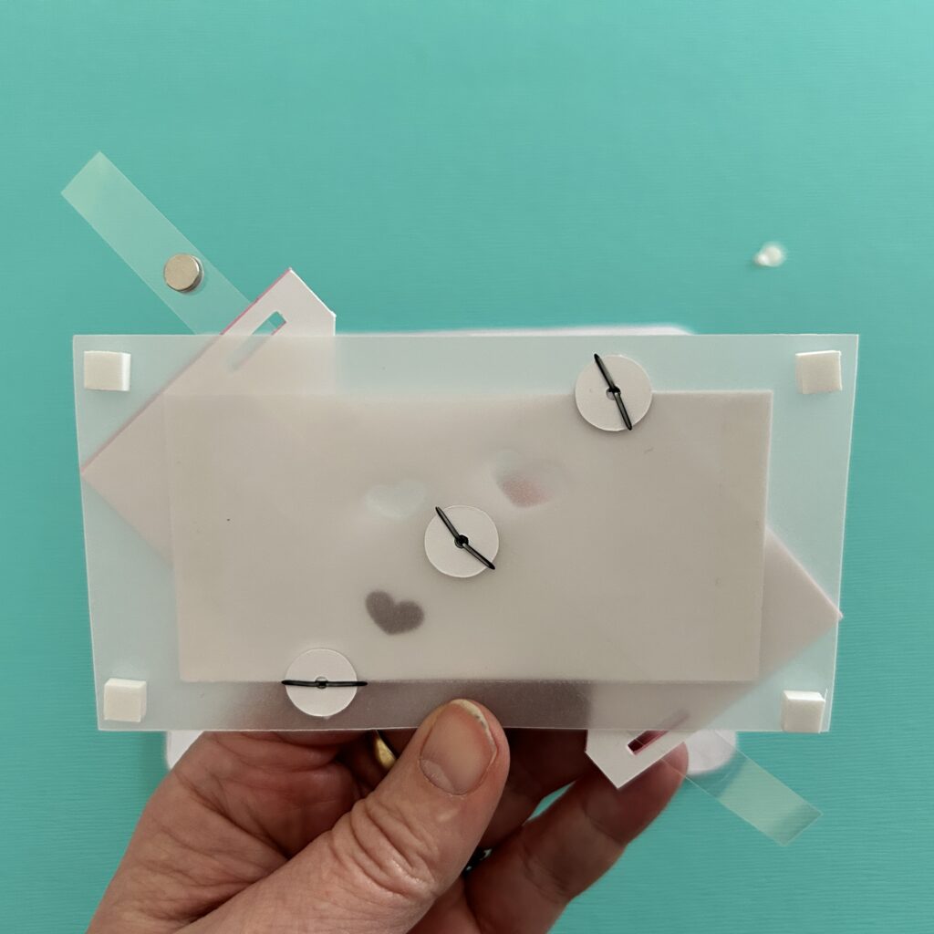 Before you remove the protective backing from the foam tape, test the placement of the card front by slipping the magnetic lever through its slot. Make adjustments if needed, before adhering the door mechanism to the front of the card.