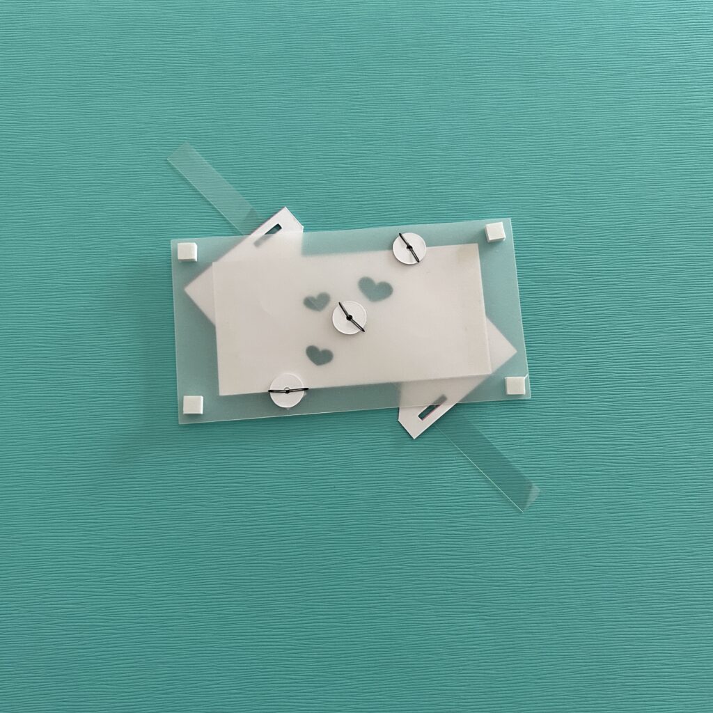 Next, apply double-sided tape to the back side of the spider piece and center it between the embossed outline on the vellum. The tape should not impede the movement of the lever.