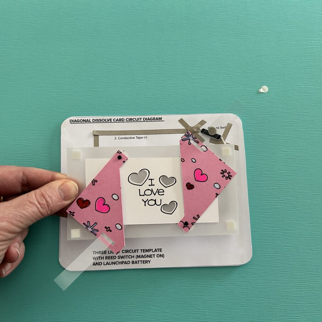 To attach the front of the card with the circuit layer, you’ll need to add foam tape around the edge of the card back, being careful not to impede the movement of the lever .